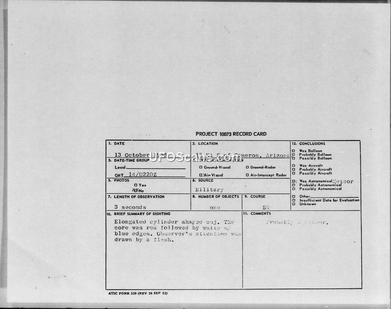 This document collection centers on Project 10073, an Air Force effort to record and evaluate Unidentified Aerial Phenomena (UAP) sightings during the late 1950s. The primary incident detailed is a sighting on October 13, 1958, by a B-47 aircraft crew near Cameron, Arizona. The observer, a captain and instructor pilot, reported an elongated, cylinder-shaped object with a red core and white-and-blue edges. The object was visible for three seconds during a shallow descent at 30,000 feet. The report explicitly notes that no sound was heard, no trail was visible, and no radar contact was made. The intelligence officer at the 97th Bomb Wing, who prepared the report, stated that no preliminary analysis could be offered and questioned the observer's ability to accurately define the object's size under the circumstances.