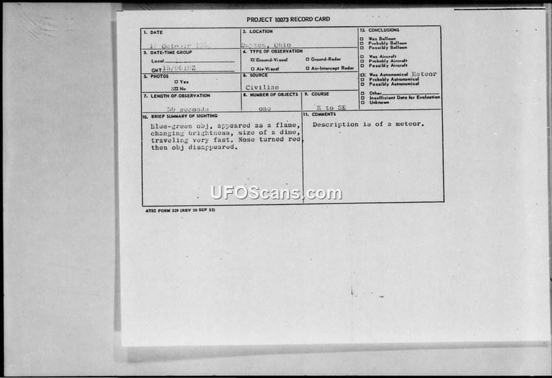 This document contains a series of Project 10073 record cards and U.S. Air Force Technical Information Sheets documenting multiple unidentified aerial phenomena sightings reported in Dayton, Ohio, during October 1958. The reports detail three distinct incidents occurring on October 14, 19, and 21. Witnesses, including civilians and personnel associated with local industry, described various objects, ranging from blue-green flame-like objects to white, L-shaped streaks of smoke. One witness, a 35-year-old male, described a blue-green object that appeared as a flame, changed brightness, and turned red before disappearing. Another report from October 21 describes a white, L-shaped trail of smoke that appeared to fade away. The Air Technical Intelligence Center (ATIC) conducted an investigation into these reports, contacting various agencies including Patterson Field Operations, Wright Field Operations, CAA Control, and the U.S. Weather Service. The investigation concluded that the sightings were likely attributable to conventional phenomena. Specifically, the official assessment for the October 21 sighting was that the evidence pointed to a condensation trail left by a jet aircraft flying at 40,000 feet. The reports include detailed questionnaires completed by the witnesses, covering aspects such as the time of day, weather conditions, the witness's location, and their personal observations of the objects' behavior, color, and sound. The documentation reflects the standard procedure for the Air Force to collect and evaluate civilian reports of UAP during this period, emphasizing the systematic verification of flight operations and meteorological data to rule out conventional explanations.