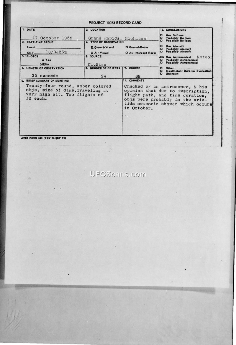 This document details a UFO sighting report filed by the 781st ACWRON regarding an event that occurred over Grand Rapids, Michigan, on October 17, 1958. The report describes the observation of twenty-four round, amber-colored objects, each estimated to be the size of a dime, traveling at a very high altitude in two distinct flights of twelve. The observation lasted approximately 25 seconds. The primary witness was an astronomer who was studying Mars at the time of the sighting. The objects were reported to be moving in a south-easterly direction. Following the initial report, the Air Technical Intelligence Center (ATIC) requested further information from the 781st ACWRON, specifically regarding the elevation and azimuth of the objects when first and last observed, and whether the witness was a professional or amateur astronomer. The 781st ACWRON subsequently clarified that the witness was an amateur astronomer. The official conclusion reached by the investigating unit, based on consultation with the astronomer, was that the objects were likely meteors associated with the Arietids meteoric shower, which occurs in October. The report also notes that there were no other aircraft reported in the area at the time, although flight plans for two B-47 aircraft (Yuletide 55 and Yuletide 62) from Lincoln AFB were reviewed as part of the investigation. The documentation includes the original Project 10073 record card, internal military message traffic between the 781st ACWRON and ATIC, and meteorological data for the time of the sighting, which indicated clear weather conditions.