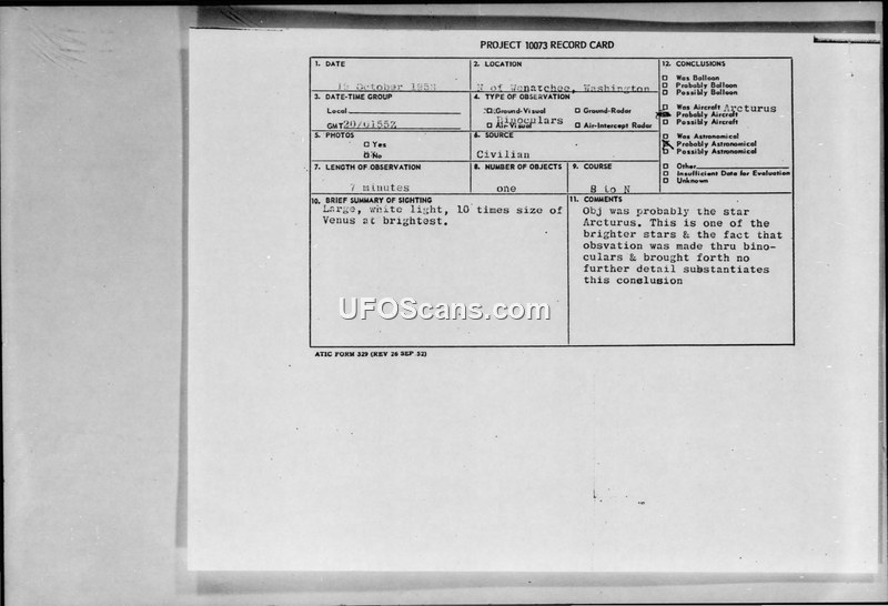 This document is a Project 10073 record card and associated teletype report detailing a sighting of an unidentified aerial phenomenon near Wenatchee, Washington, on 20 October 1958. The witness, a 40-year-old civil engineer, observed a large, white light, estimated to be ten times the size of Venus at its brightest, moving from south to north for approximately seven minutes. The observation was made using binoculars, which revealed no additional features or silhouette. The weather conditions were reported as clear with perfect visibility. The investigating officer from the 62nd Troop Carrier Wing noted that while the witness possessed above-average intelligence and technical knowledge, his interest in science fiction likely influenced his interpretation of the event. The official conclusion reached by the Air Technical Intelligence Center was that the object was likely the star Arcturus. The report acknowledges that while the object could have been a high-altitude aircraft such as an F-104, the presence of such aircraft could not be confirmed, leading to the submission of the report despite the likely astronomical explanation.