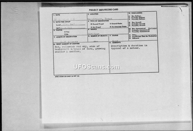 A student in Sweetwater, Texas, reported a silent, yellowish-red, basketball-sized object with a trail of fire on October 20, 1958. The Air Technical Intelligence Center concluded the object was a meteor.
