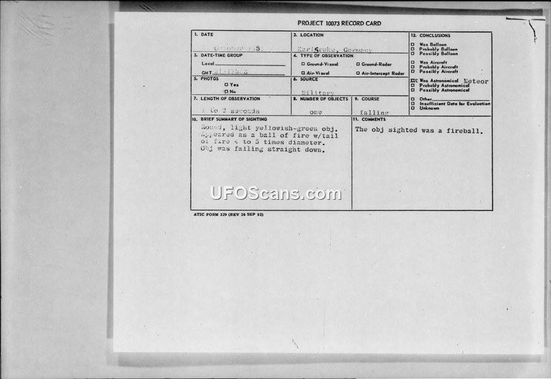 On October 21, 1958, at 1755Z, a sighting of an unidentified aerial object occurred near Karlsruhe, Germany. The report, filed under Project 10073, describes a round, light yellowish-green object that appeared as a ball of fire with a tail four to five times its diameter. The object was observed falling straight down for a duration of one to two seconds. The primary witness was Captain William L. Mathews, a flight commander with the 461st TACFITRON, who was deemed reliable. His account was corroborated by Captain Glenn M. Johnson, the operations officer, who noted that the object appeared as a small light that suddenly grew larger before dropping below the horizon. The intelligence officer, 1st Lieutenant James R. Nuss, processed the report in accordance with AFR 200-2. Weather conditions at the time included haze and scattered cloud layers. Radar checks conducted with flight service yielded negative results. The official conclusion recorded on the project card identified the object as an astronomical meteor, though the reporting officer noted the possibility that it could have been a night photo reconnaissance flare.