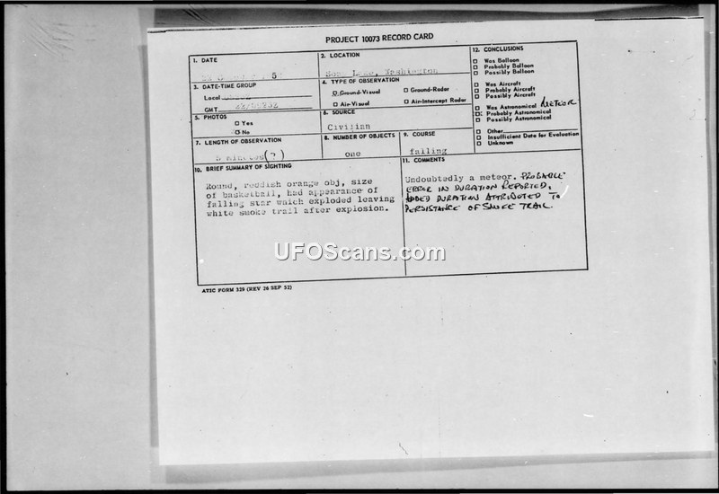 A witness in Soap Lake, Washington, reported a falling, exploding object on October 22, 1958. Military intelligence concluded the object was a meteor and dismissed the witness's account as exaggerated.