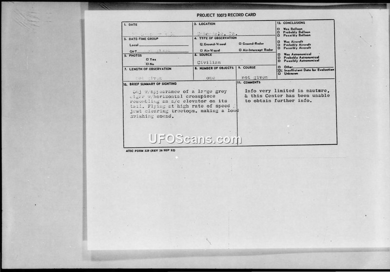 Project 10073 Record Card: Unidentified Flying Object Sighted on 27 October 1958