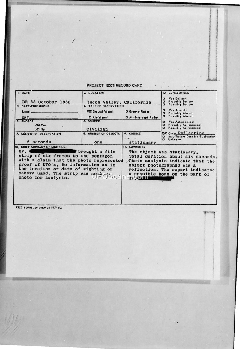 This document collection details the investigation of an 8mm film strip submitted to the Pentagon on 25 October 1958 by a civilian from Yucca Valley, California. The individual claimed the film provided proof of UFOs. The film was forwarded to the Air Technical Intelligence Center (ATIC) at Wright-Patterson Air Force Base for analysis. Major Robert J. Friend and other ATIC personnel examined the film, which contained six frames showing a stationary object. The analysis concluded that the object was a reflection of some sort. The investigators noted that the individual did not provide information regarding the location, date, or camera used, and they expressed skepticism regarding the authenticity of the claim, suggesting it was a possible hoax. The final correspondence, dated 5 January 1959, confirms the return of the film to the individual with the official conclusion that the images were merely reflections. The documents include a Project 10073 record card, internal routing sheets, and formal letters between Major Lawrence J. Tacker of the Public Information Division and the ATIC.