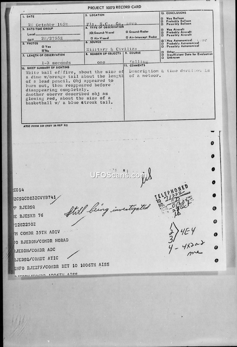 Internal military communications, including messages between the 32nd Air Division, the Air Technical Intelligence Center (ATIC), and the 35th Air Division, indicate that this sighting was part of a broader series of reports across the southeastern United States on the same date. Other agencies reported similar fireball sightings in Florida and Georgia. The consensus among the reporting agencies, as noted on the Project 10073 record card, was that the description and duration of the sighting were consistent with a meteor. Some reports of 'tumbling' objects were attributed to the re-entry of a USSR satellite. The documents conclude that there was no further evidence to suggest the object was anything other than a natural phenomenon, and the case was closed with the classification of the reports to protect official interests regarding re-entering space debris.