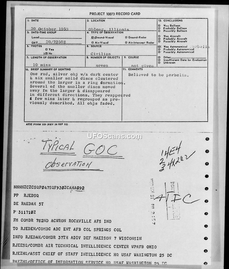This document consists of a series of military communications and a Project 10073 record card regarding an Unidentified Flying Object sighting reported in Oblong, Illinois, on October 30, 1958. Two witnesses, manning a Ground Observer Corps (GOC) post, observed a formation of seven objects for approximately ten minutes. The formation was described as a single, round, silver object with a dark center, surrounded by six smaller, solid silver discs in a ring formation. During the observation, the smaller discs were seen moving away from the central object in different directions before disappearing, only to reappear and regroup a few minutes later. All objects eventually faded from view. The report was initially submitted by the 782nd ACWRON at Rockville AFS, Indiana, to the Air Technical Intelligence Center (ATIC). ATIC found the initial report to be 'very meagre' and requested a more complete investigation in accordance with Air Force Regulation 200-2. A subsequent follow-up report provided a statement from the witnesses and noted that an investigation into weather conditions and potential aircraft flights in the area failed to provide any explanation for the sighting. The investigation could not confirm the report through any other sources, and the investigating officers offered no explanation for the identity of the objects. The record card itself notes the conclusion as 'Believed to be parhelia,' a meteorological phenomenon involving sun dogs or ice crystals, though the investigative text emphasizes the lack of a definitive explanation.