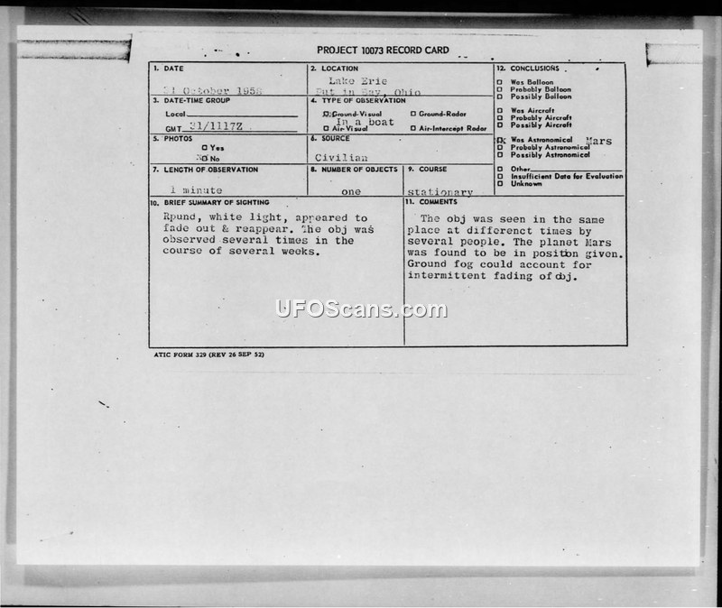 Commercial fishermen reported a stationary, bright light over Lake Erie in October 1958. The Air Technical Intelligence Center investigated the sightings and concluded the object was the planet Mars, with fog causing the observed fading.
