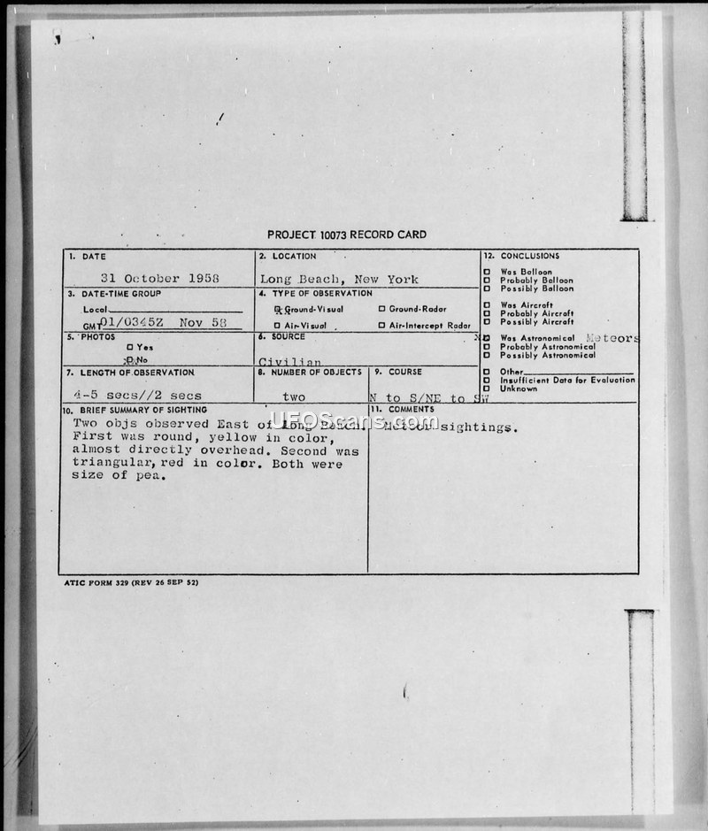 Project 10073 Record Card — Long Beach, New York, 31 October 1958