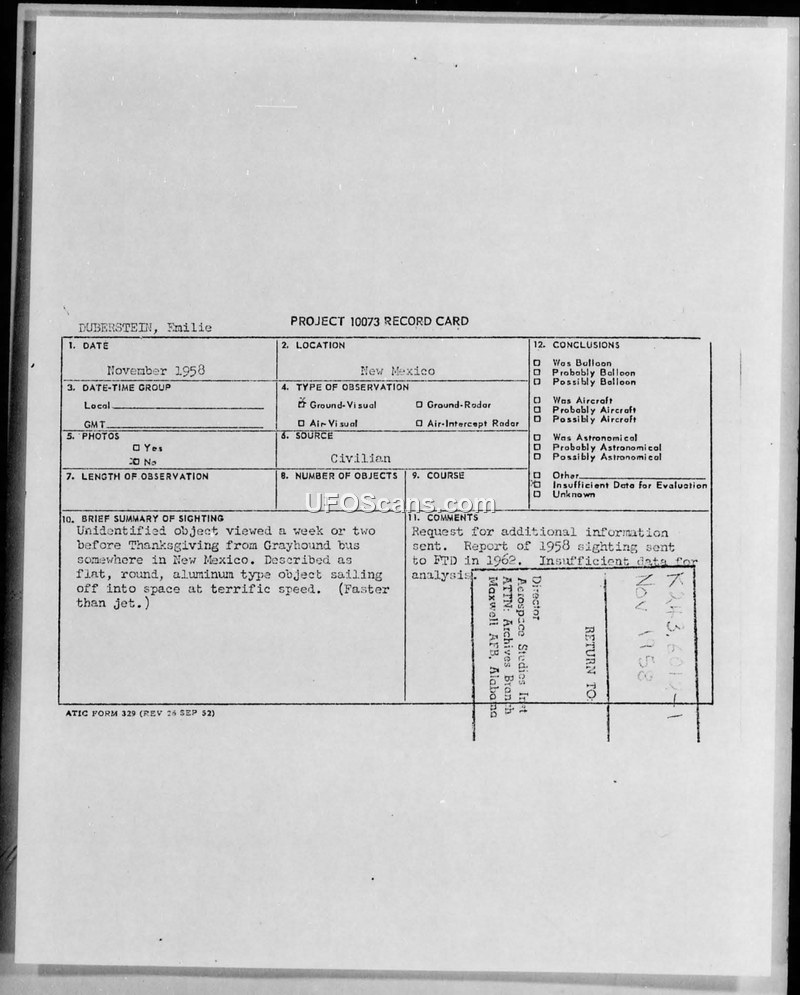 This document file contains a Project 10073 record card and associated correspondence regarding a UFO sighting reported by Emilie Duberstein. The witness reported observing an unidentified object while traveling on a Greyhound bus in New Mexico, approximately one or two weeks before Thanksgiving in 1958. She described the object as a flat, round, aluminum-type craft that appeared to sail off into space at a speed she characterized as faster than a jet. The witness, who was traveling from California to Cleveland, Ohio, noted that the sighting occurred on a very clear day. She mentioned that she had not discussed the event with many people due to a fear that she would not be believed. In March 1962, after reading an article in the Cleveland Press titled 'Flights and Fliers: Flying Saucer Reports Continue to Be Made,' she decided to submit her report to the authorities. The Foreign Technology Division (FTD) at Wright-Patterson Air Force Base received the report and, on April 3, 1962, issued a memorandum to Hq USAF (SAFOI-3b) stating that the information provided was insufficient to form a conclusion. The FTD requested that a questionnaire be sent to the witness to gather more specific details about the incident. The file includes the original record card, the official memorandum from the FTD, and the witness's personal letter detailing her experience.