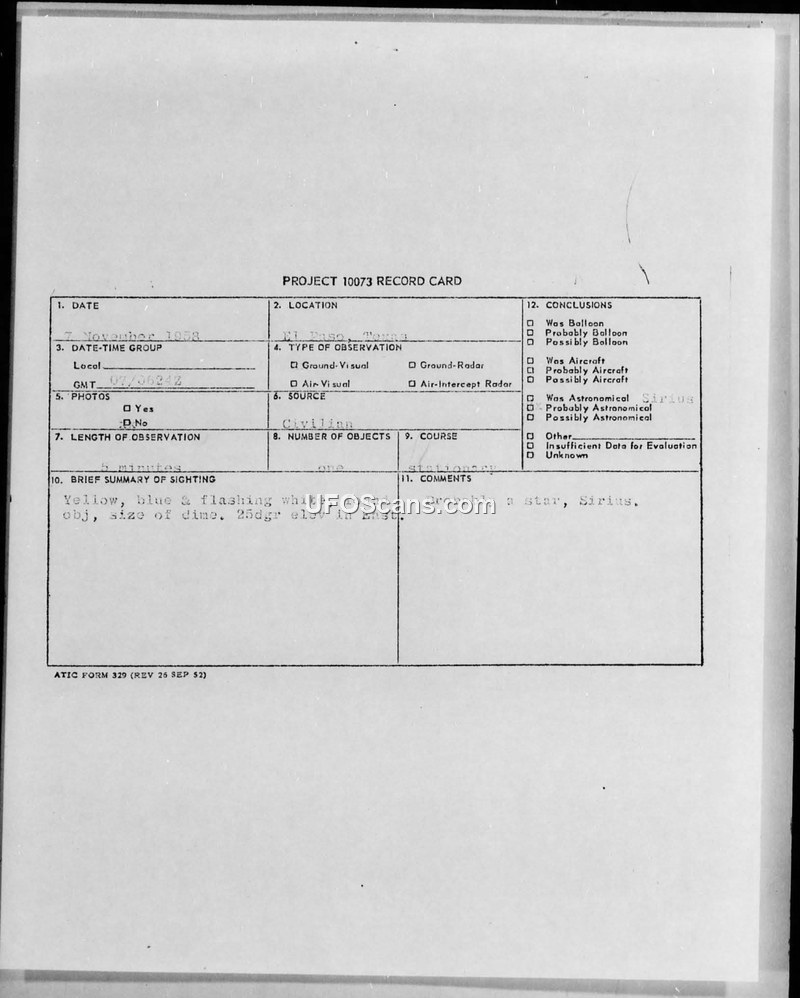 A 1958 sighting report from El Paso, Texas, describes a stationary, multi-colored object observed for five minutes. The military investigation concluded the object was likely the star Sirius.