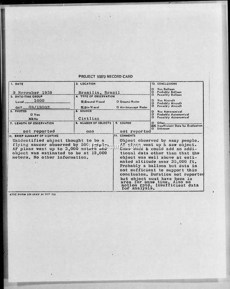 On November 9, 1958, at approximately 16:00 local time, an unidentified object was observed by an estimated 500 people in Brasilia, Brazil. The sighting was reported as a 'flying saucer.' In response to the event, a Brazilian Air Force (FAB) aircraft was dispatched to investigate. The pilot ascended to an altitude of 3,000 meters but was unable to obtain additional data or intercept the object. Upon returning to base, the pilot reported that the object appeared to be at an altitude of approximately 12,000 meters, or 35,000 feet. The official record card for Project 10073 notes that the object remained in the area for some time, though no specific motion was reported. The evaluating agency concluded that while the object might have been a balloon, the available information was insufficient to support a definitive conclusion or to perform a comprehensive analysis. The incident was also documented in an FBIS Latin America report dated January 2, 1959, which reiterated that the FAB plane commander found no results during the investigation.