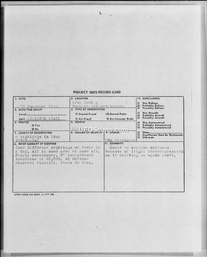 This document consists of a Project 10073 record card and an associated incoming Air Force staff message regarding a series of unidentified aerial phenomena observed on 13 November 1958. The report details four separate sightings occurring throughout the day in the vicinity of Troy Peak and Tonopah Airport, Nevada. The objects were tracked by ground-based radar systems, specifically the FPS-20, MPS-7, and MPS-14, and were also observed visually. The observers noted that the objects remained in the same general area and at the same altitude, exhibiting a fairly stationary behavior or moving slowly in an east-northeasterly direction. The sightings lasted intermittently over an eight-hour period. Weather conditions were reported as clear and calm, with a notable temperature inversion recorded at 60,000 feet. The reporting officer concluded that the objects were likely weather balloons, citing their flight characteristics, which appeared to be consistent with drifting in the winds aloft. This conclusion was further supported by the observation of a weather balloon passing over the site at an unknown altitude. The report was filed in accordance with Air Force Regulation 200-2, which governed the reporting of unidentified flying objects at the time.
