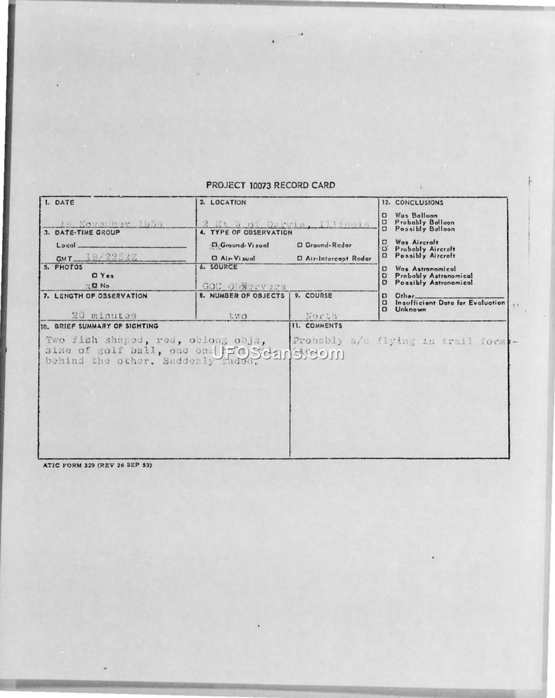 This document consists of a Project 10073 record card and an accompanying military report regarding an unidentified flying object sighting near Darwin, Illinois, on November 19, 1958. The witness, identified as a civilian, reported observing two red, fish-shaped objects, each approximately the size of a golf ball, flying in a trail formation. The objects were observed for 20 minutes, maintaining a straight flight path heading north at a high altitude. The witness noted that the objects suddenly faded from view. The report indicates that this was not an isolated incident; the observer claimed that the same visual phenomenon had been reported on at least three previous occasions by six or more different individuals at the same Ground Observer Corps (GOC) post. These sightings consistently occurred between dusk and dawn. The military investigation, conducted by the 752nd ACWRON at Rockville AFS, Indiana, and submitted to the Air Technical Intelligence Center (ATIC), concluded that the objects were likely aircraft flying in trail formation. The report notes that F-84 aircraft were flying out of Hulman Field on VFR flights throughout the afternoon of the incident. The final assessment dismissed the unidentified nature of the objects, attributing them to standard military flight operations.