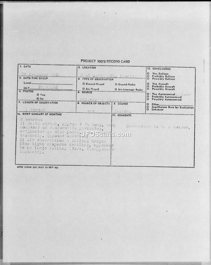 A sighting of a falling blue light with a particle trail was reported by a ground observer and a pilot near Eglin AFB on 23 November 1958. Despite the observer's reliability, the official conclusion was that the object was a meteor.
