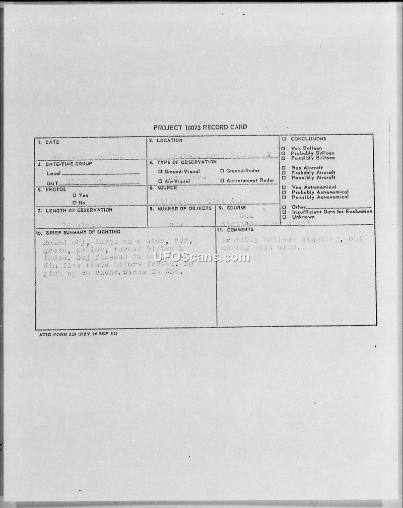 The object was observed by a tower operator and ten others. Investigations with the 26th Air Division and the US Navy confirmed no aerial operations were in progress in the area (W-105/W-106) at the time of the sighting.