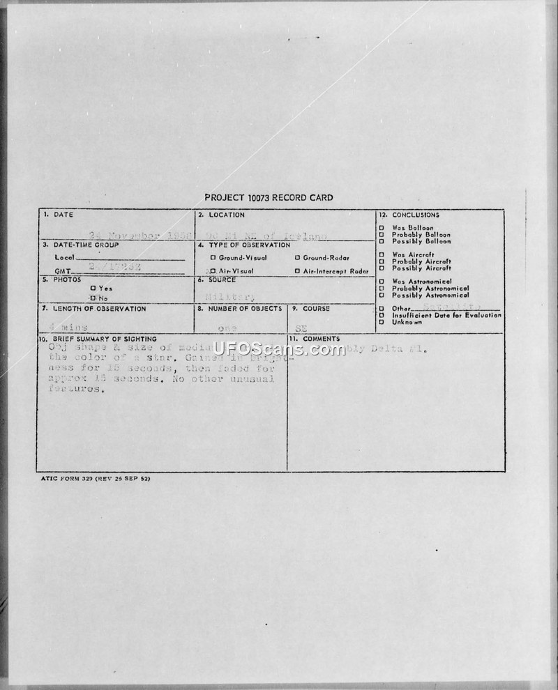 Project 10073 Record Card: Sighting of Unknown Object, 24 November 1958