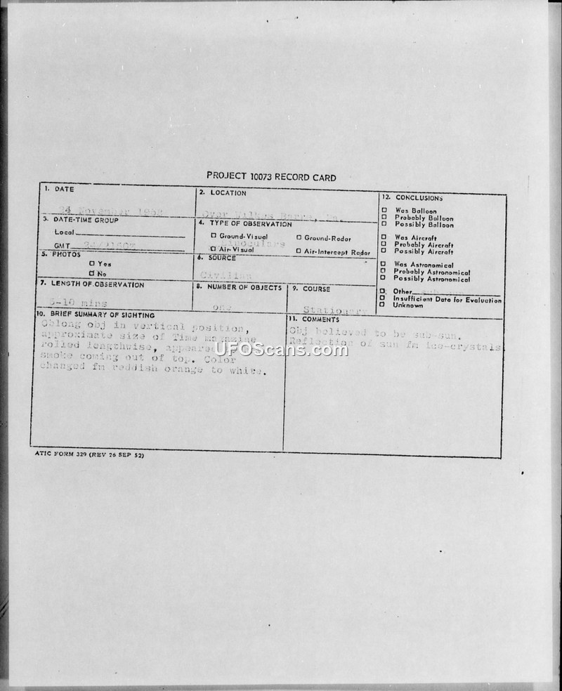 This document collection details a UFO sighting reported on November 24, 1958, over Wilkes-Barre, Pennsylvania. The primary record is a Project 10073 record card, supported by a series of military teletype messages between the 26th Air Division and the Air Technical Intelligence Center (ATIC). The witness, a pilot, observed an oblong or cigar-shaped object that appeared to be in a vertical position. The object was described as being the size of a rolled-up Time magazine held at arm's length. Its color shifted from reddish-orange to white, and it appeared to emit smoke from its top. The object remained stationary for approximately five to ten minutes before being obscured by an overcast sky. Binoculars were used during the observation, though the magnification power was unknown. The military investigation, conducted in accordance with AFR 200-2, sought specific details regarding the object's size, flight path, and disappearance. Following the inquiry, the official conclusion reached by the Air Technical Intelligence Center was that the object was a 'sub-sun' phenomenon, resulting from the reflection of the sun off ice crystals in the atmosphere. Some observers on the aircraft involved in the sighting had also suggested the object was merely a cloud formation.