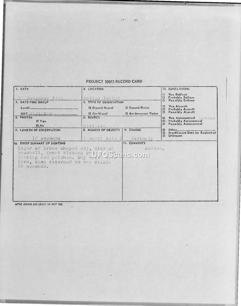 Project 10073 Record Card — Baffin Island, 27 November 1958