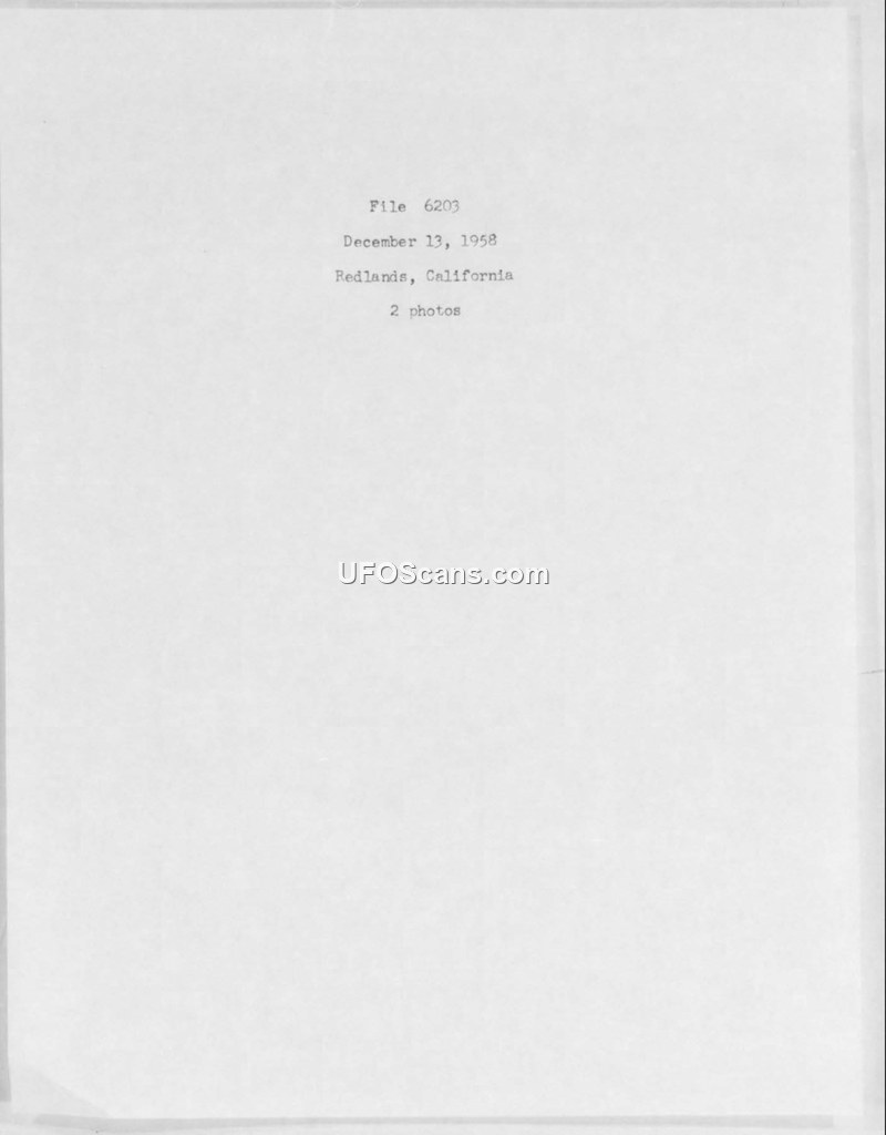 This document is a file record (File 6203) containing two photographs of an unidentified object sighted in Redlands, California, on December 13, 1958. It provides no further context or analysis regarding the sighting.