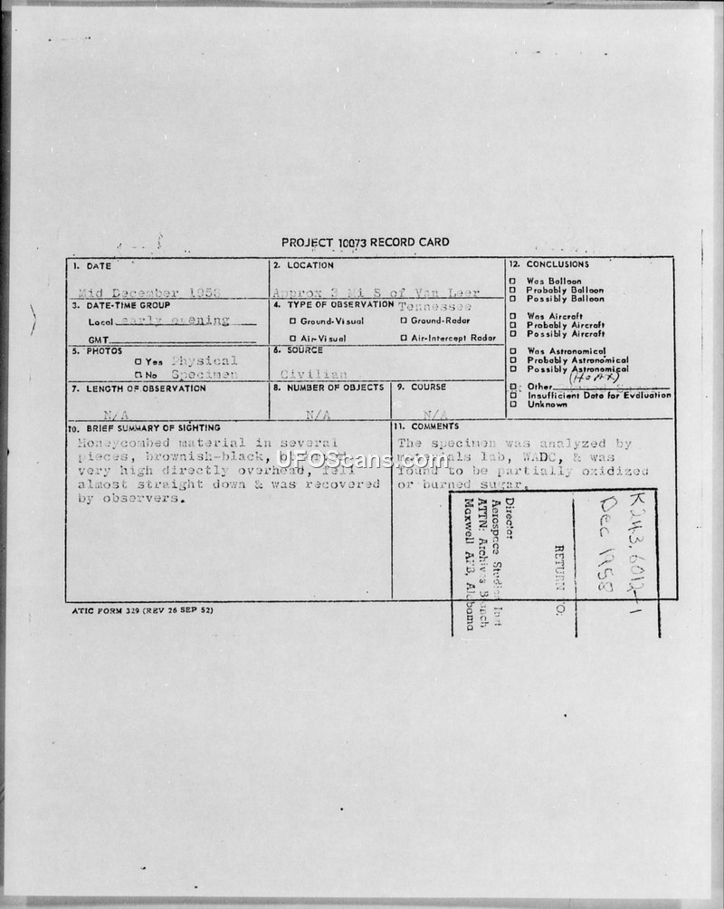 A UFO sighting in Tennessee involving the recovery of physical material was investigated by the Air Force. Laboratory analysis identified the material as partially oxidized or burned sugar.