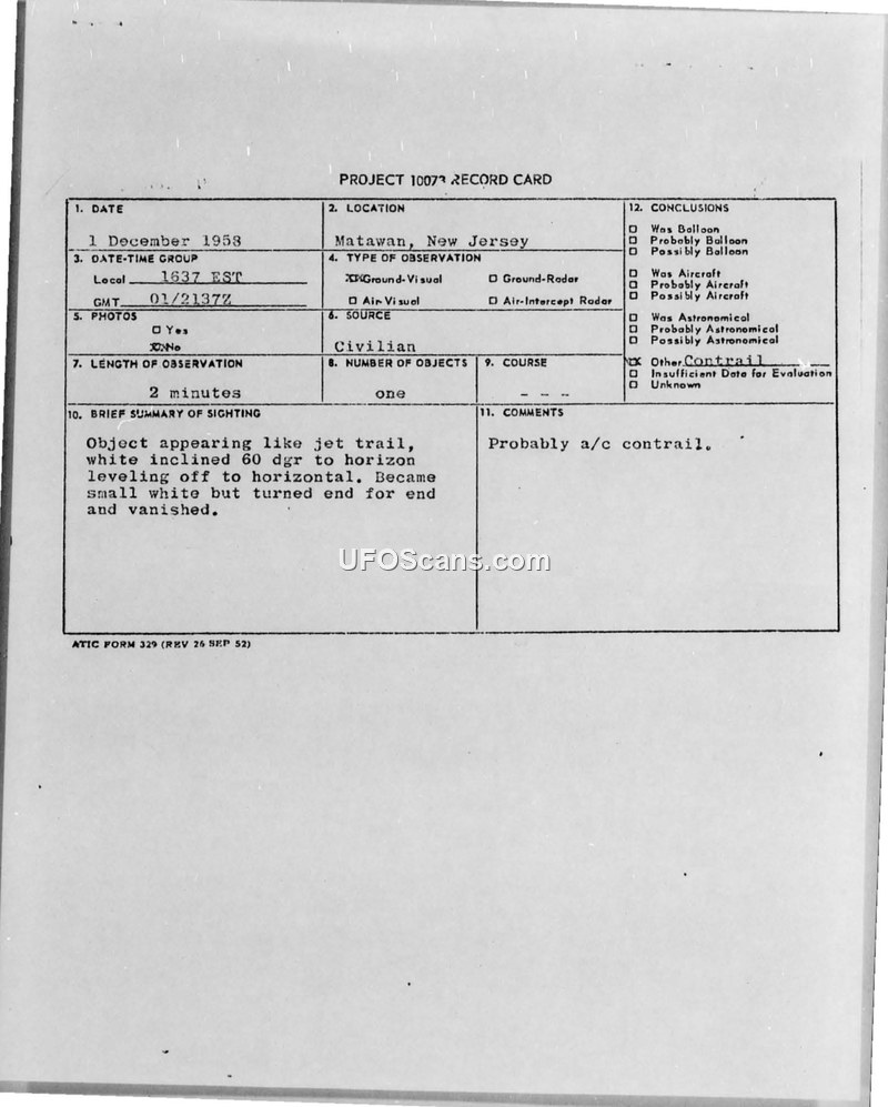 Three engineers in Matawan, New Jersey, reported a UFO sighting on 1 December 1958. The Air Force deemed the initial report insufficient and requested further documentation from the witnesses.