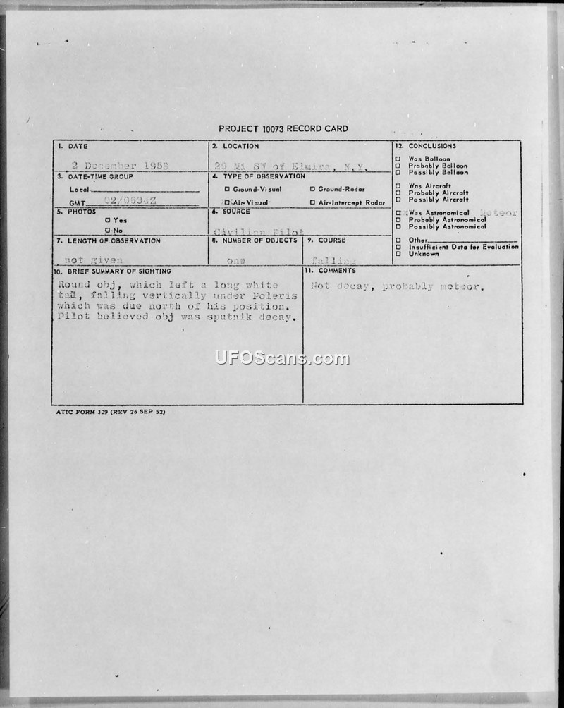 A civilian pilot reported a round object with a long white tail falling vertically near Elmira, NY, on December 2, 1958. While the pilot suspected it was Sputnik 3 debris, official military assessment concluded it was likely a meteor.