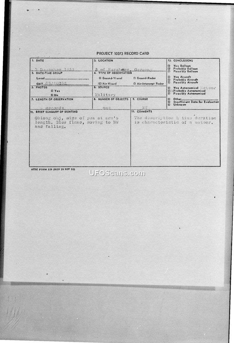Captain William L. Clutter reported observing an oblong, blue-flamed object while flying over Germany on 3 December 1953. The sighting was officially concluded to be a meteor.