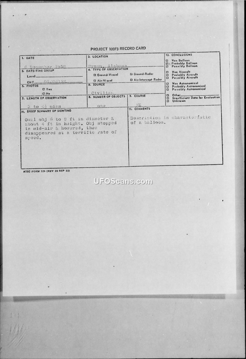 A civilian guard at Anniston Ordnance Depot reported an oval object hovering at 75 feet on December 6, 1958. The official conclusion categorized the sighting as characteristic of a balloon.