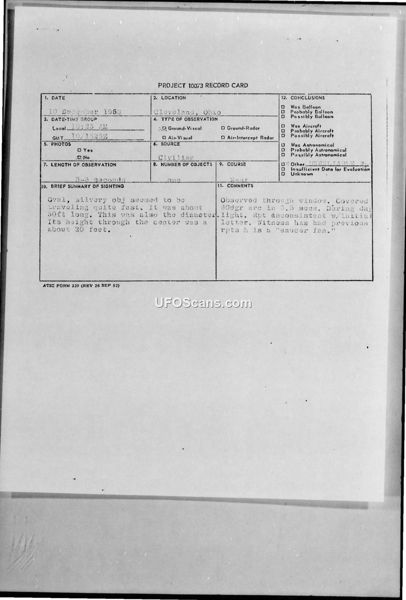 Project 10073 Record Card — Cleveland, Ohio, 10 December 1958