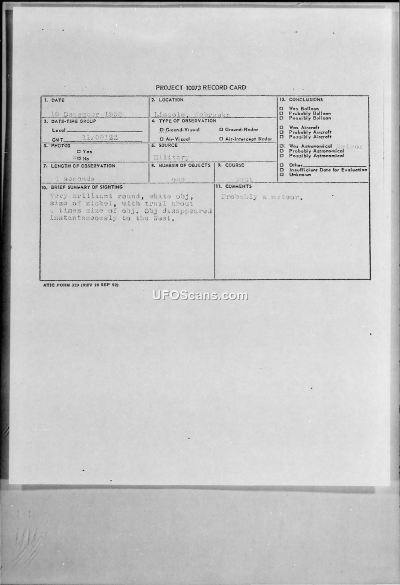 A UAP sighting by a rated Air Force navigator in Lincoln, Nebraska, on 11 December 1958 was officially evaluated as a meteor by the 98th Bombardment Wing Intelligence Division.