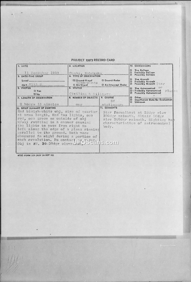 A 1958 UFO sighting report from Omaha, Nebraska, involving three witnesses who observed a stationary, rotating, multi-colored light for over two hours. The military investigation concluded the object likely exhibited characteristics of an astronomical body, such as the stars Formalhaut or Altair.