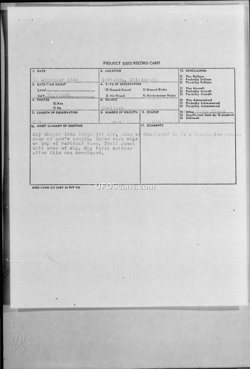 Project 10073 Record Card and Correspondence — Redlands, California, 13 December 1958
