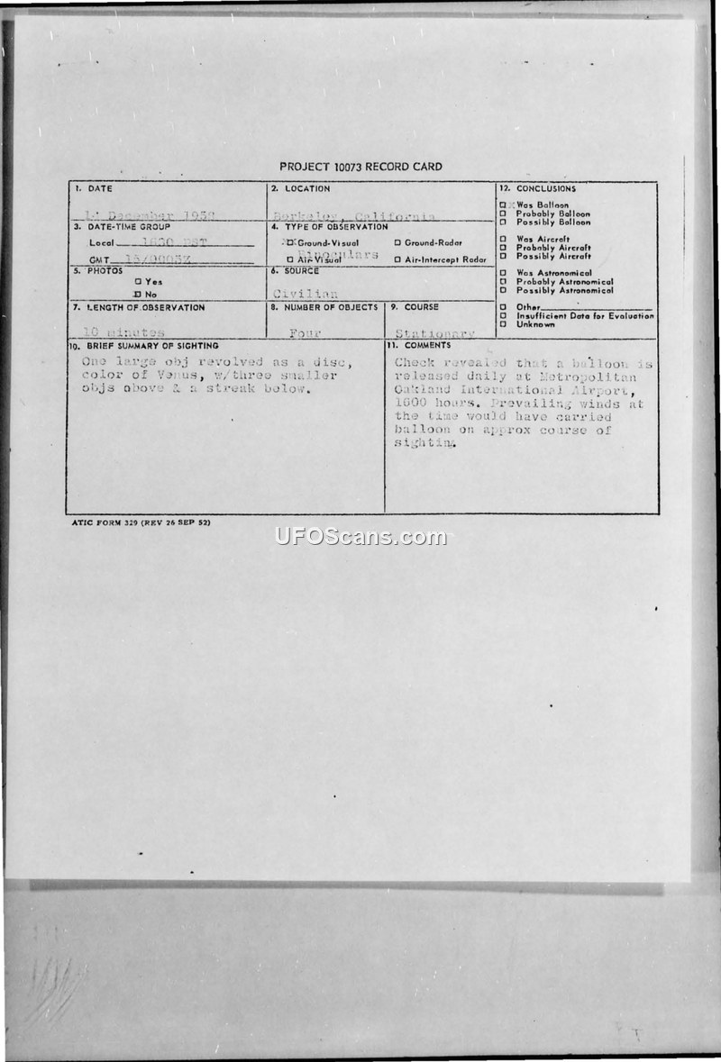 This document collection details a UAP sighting reported by a civilian in Berkeley, California, on December 14, 1958. The witness, who identified himself as a licensed pilot and Reserve Flight Surgeon, observed four objects through 7x35 binoculars: one large, disc-shaped object resembling the color of Venus, accompanied by three smaller objects and a streak. The witness reported the objects were stationary for approximately ten minutes. The Air Force, through the Air Technical Intelligence Center (ATIC), investigated the report under Project 10073. The official Air Force conclusion was that the objects were a weather balloon (rawinsonde) released daily from the Metropolitan Oakland International Airport, which would have drifted into the observed position due to prevailing winds. The Air Force also noted that these balloons are equipped with radar reflectors, which could account for the smaller objects observed. The witness engaged in a lengthy correspondence with the Air Force, expressing skepticism regarding the balloon explanation. He noted that the objects were brighter than Venus and appeared stationary, and he questioned the accuracy of the Air Force's azimuth calculations regarding a Thor missile firing mentioned in Aviation Week. The witness requested that the Air Force confirm whether he and his wife, who also witnessed the event, were in full command of their senses, emphasizing their professional backgrounds as pilots. The Air Force maintained its position, providing technical details about the balloon's altitude, albedo, and radar equipment to support their conclusion.