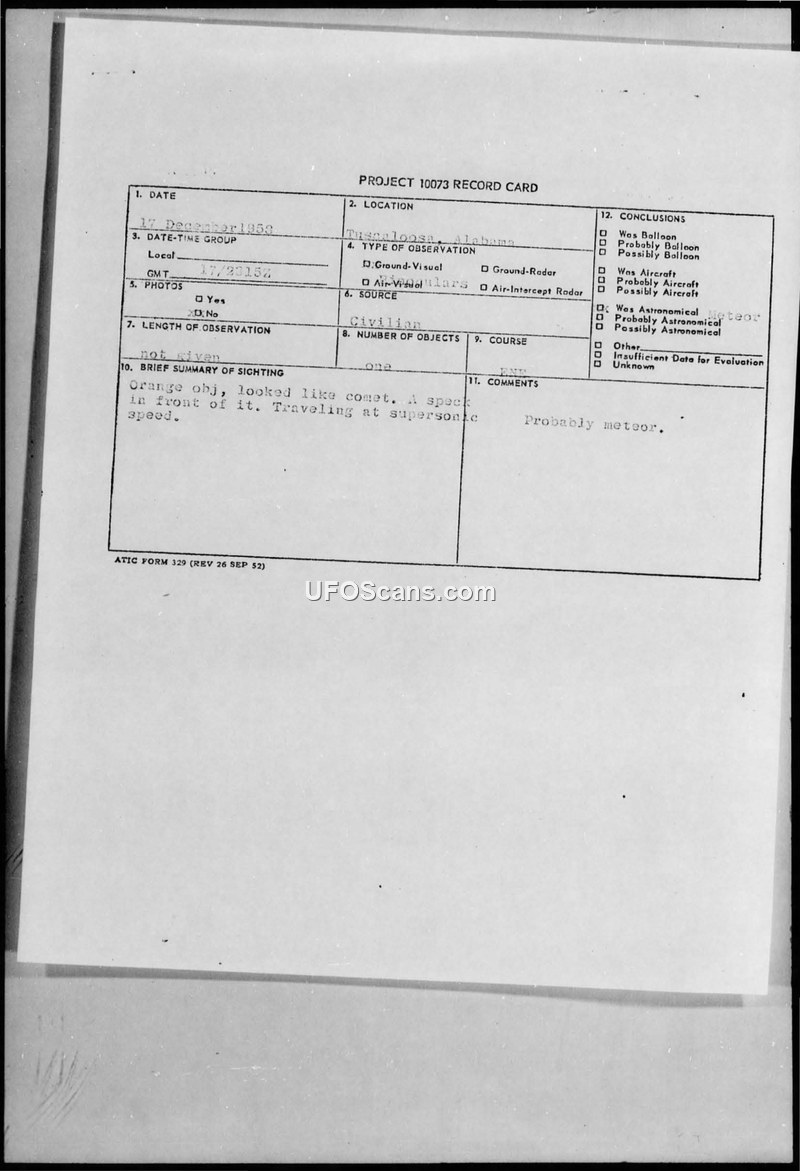 A civilian in Tuscaloosa, Alabama, reported an orange, comet-like object moving at supersonic speeds on 17 December 1953. Military intelligence evaluated the sighting and concluded it was likely a meteor.
