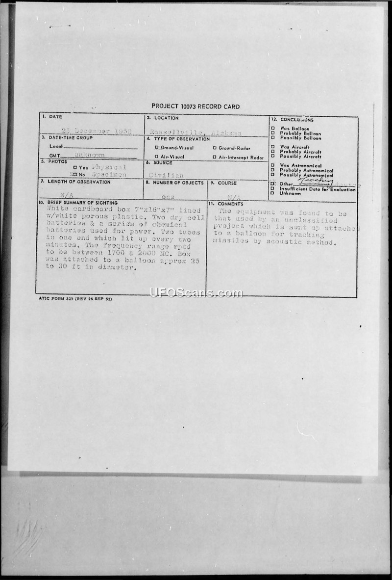 This document details the recovery and identification of an object found by a civilian in Russellville, Alabama, on 25 December 1958. The object, described as a white cardboard box measuring 7"x16"x7" and lined with white porous plastic, was found attached to a balloon approximately 25 to 30 feet in diameter. The box contained two dry cell batteries, chemical batteries, two tubes, and solar batteries, and was marked with the words 'Activator for Transistor'. The item was initially reported to the 4228th Strategic Wing (SAC) at Columbus Air Force Base, Mississippi, by a civilian witness. Following a request from the Intelligence Division of the 4228th Strategic Wing, the object was turned over to the National Guard for forwarding to the Air Technical Intelligence Center (ATIC) at Wright-Patterson Air Force Base. Subsequent investigation by the Air Force identified the device as equipment utilized in an unclassified joint Army and Air Force project known as 'New Product' and 'Stop Light'. The project involved launching such equipment from the White Sands Missile Range in New Mexico to track missiles using acoustic methods. The document includes a record card for Project 10073 and correspondence confirming the identification of the device, noting that the batteries were constructed to generate voltage for the acoustic circuit. The classification of the document was eventually cancelled under AFR 205-10.