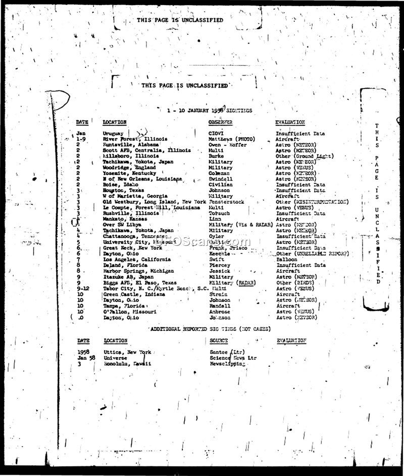 This document is a 21-page chronological log of UAP sightings reported globally during 1958. It categorizes each event by date, location, observer, and official evaluation, providing a snapshot of the reporting and assessment process during that year.