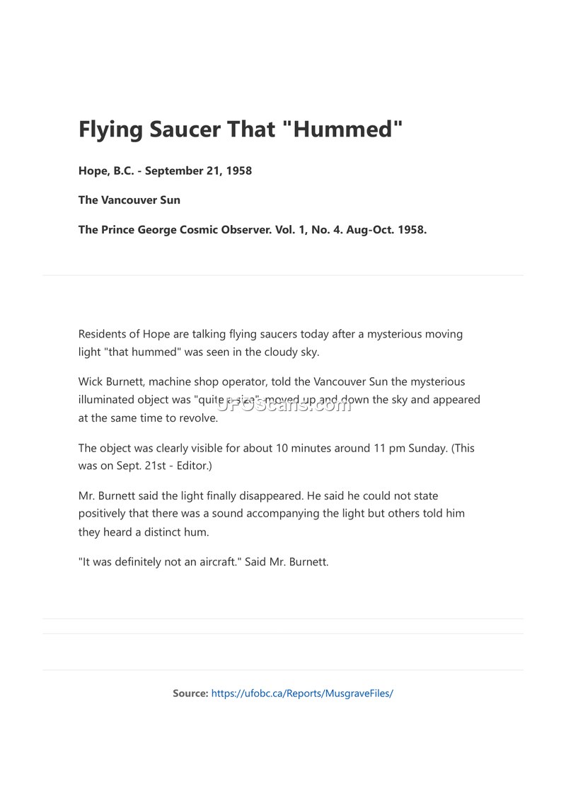A report from September 1958 detailing a sighting of an unidentified, humming, illuminated object by residents in Hope, B.C. The witness, Wick Burnett, described the object as non-aircraft.