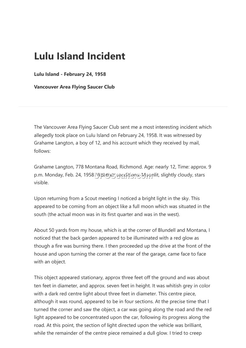 This document details a UFO sighting reported by 12-year-old Grahame Langton on Lulu Island, British Columbia, on February 24, 1958. According to the report, Langton observed a bright light in the sky while returning from a Scout meeting. Upon reaching his home at 778 Montana Road, he discovered a stationary, whitish-grey object hovering approximately three feet above the ground near his garage. The object was described as being ten feet in diameter and seven feet tall, featuring a dark red center light divided into four sections. Langton reported that the object's light appeared to track a passing car on the road. When Langton attempted to approach the object, it reacted to his presence, dimming its light and then brightening again. The object subsequently emitted a buzzing sound from balls located on the ends of projecting arms before departing at a tilted angle toward a moon-like object in the sky. Langton also noted that he had heard a similar buzzing sound in the same area of his garden earlier that afternoon. Following the incident, an RCMP constable and a representative from the RCAF were informed of the event; both reportedly expressed no reason to doubt the witness's account. Members of the Vancouver Area Flying Saucer Club later visited the Langton residence on March 14, 1958, to interview the boy, concluding that his testimony was credible due to the high level of detail provided.