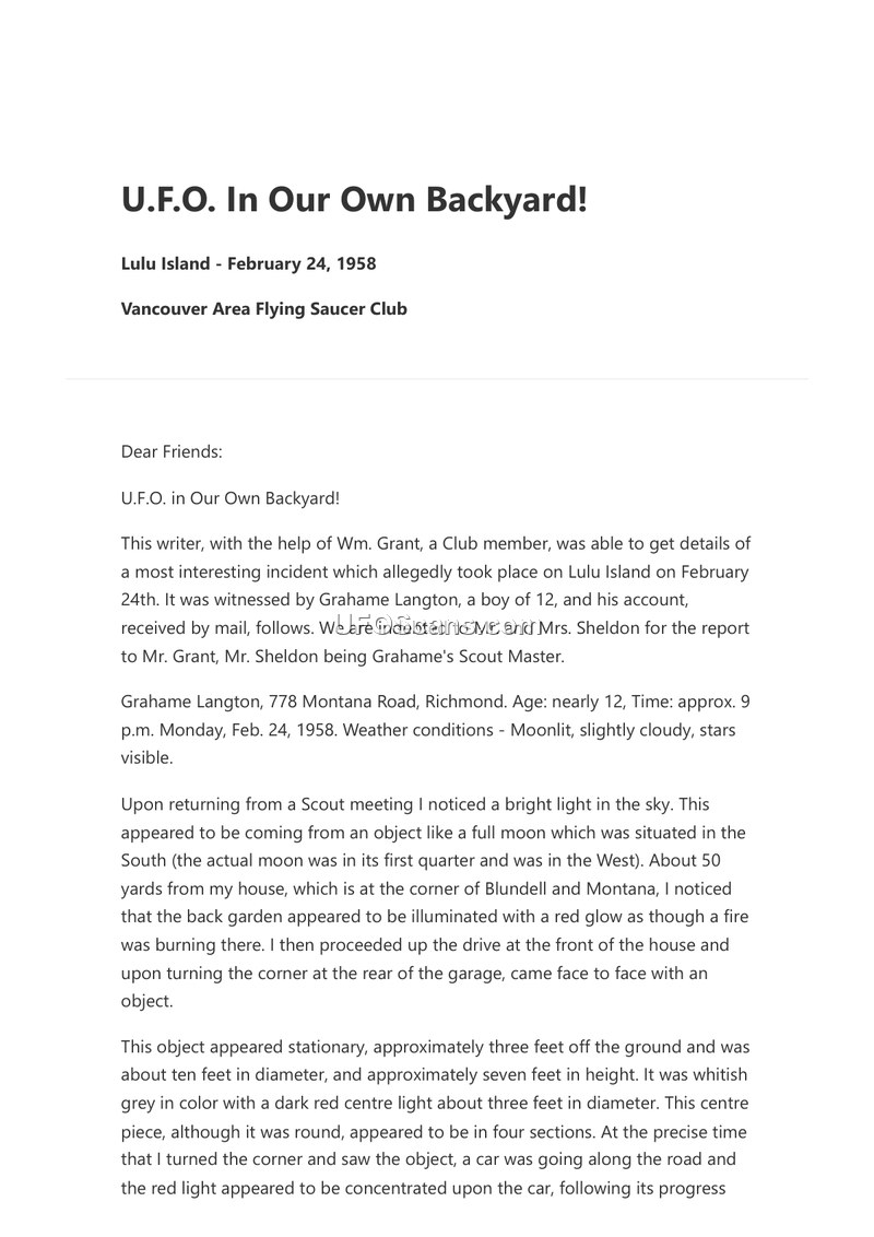 This document is a report from the Vancouver Area Flying Saucer Club detailing a UFO sighting on Lulu Island, British Columbia, on February 24, 1958. The witness, a 12-year-old boy named Grahame Langton, reported encountering a stationary, whitish-grey object approximately 10 feet in diameter and 7 feet in height while returning from a Scout meeting around 9 p.m. The object hovered three feet off the ground and featured a dark red, four-sectioned center light that appeared to focus on a passing car. The witness described the object as having projecting arms with buzzing balls at the ends and square windows in an outer circle. He also noted a buzzing sound on the ground earlier that afternoon, which he associated with the later event. Following the incident, an RCMP constable visited the home and could offer no explanation, and an RCAF representative also spoke with the family, reportedly agreeing that the boy was telling the truth. Members of the Flying Saucer Club later interviewed the boy and concluded that his detailed account was credible. Physical evidence mentioned includes broken twigs on a tree near the site of the alleged hovering.