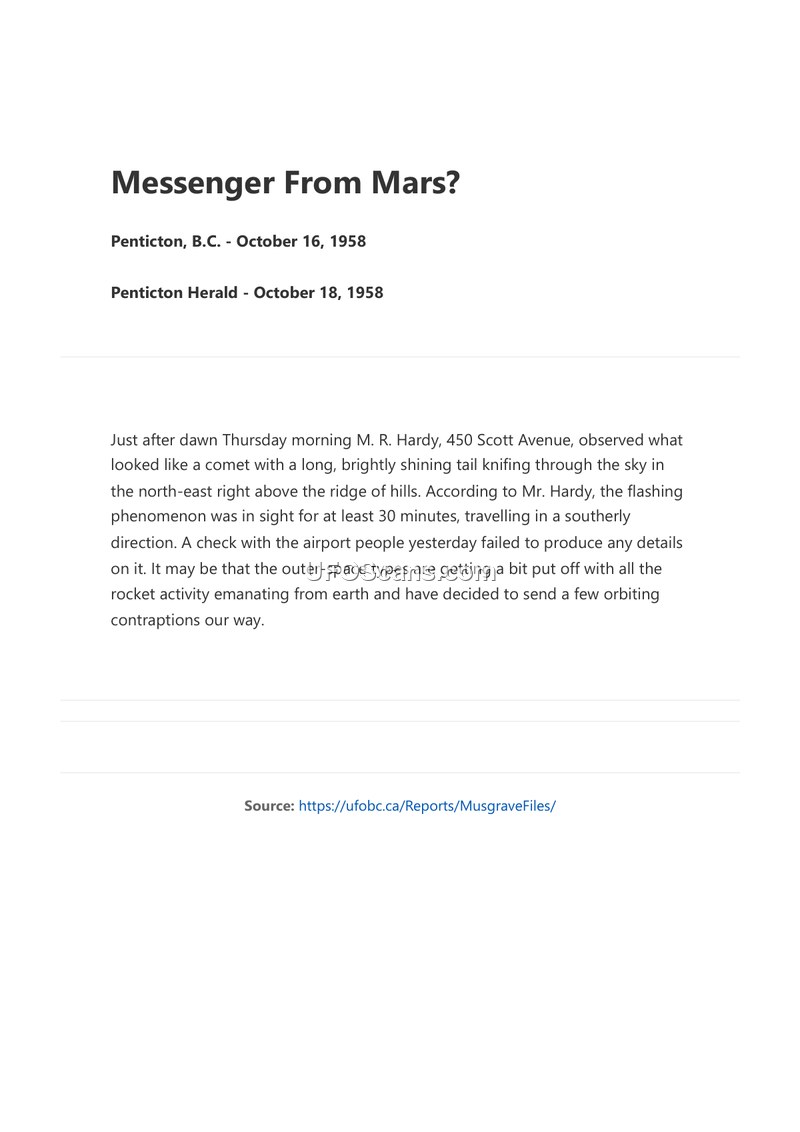 On the morning of October 16, 1958, a resident of Penticton, British Columbia, named M. R. Hardy, reported observing an unusual aerial phenomenon. According to the report published in the Penticton Herald on October 18, 1958, Mr. Hardy, who resided at 450 Scott Avenue, witnessed an object that appeared similar to a comet, characterized by a long, brightly shining tail. The object was observed just after dawn, moving in a southerly direction above a ridge of hills. The witness reported that the flashing phenomenon remained visible for at least 30 minutes. Following the sighting, inquiries were made with local airport personnel, but they were unable to provide any details or confirmation regarding the object. The article concludes with a speculative remark suggesting that the phenomenon might be related to extraterrestrial interest in Earth's rocket activity.