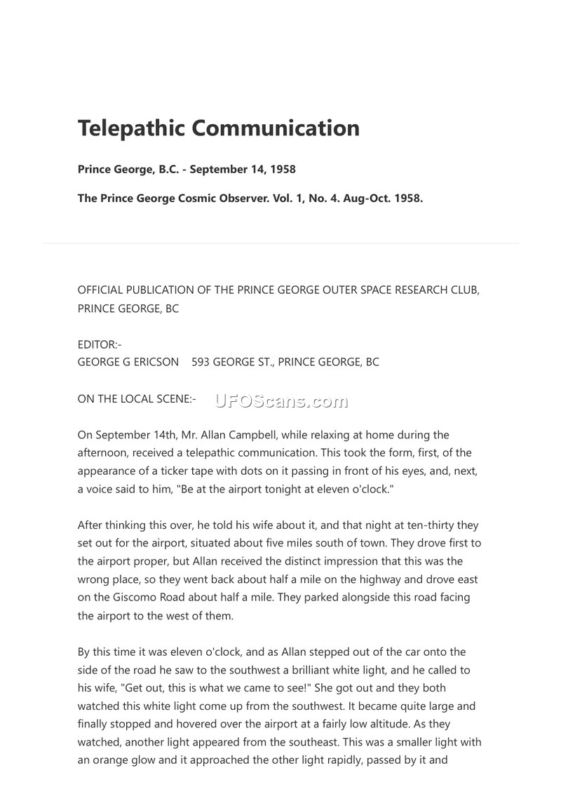 On September 14, 1958, Mr. Allan Campbell of Prince George, British Columbia, reported receiving a telepathic communication while at home. He described seeing a ticker tape with dots passing before his eyes, followed by a voice instructing him to be at the airport at 11:00 p.m. That evening, Mr. Campbell and his wife drove to the airport area. After an initial feeling that they were in the wrong location, they repositioned themselves on Giscomo Road. At 11:00 p.m., Mr. Campbell observed a brilliant white light to the southwest, which hovered at a low altitude over the airport. Shortly thereafter, a second, smaller object with an orange glow appeared from the southeast, approached the first light, and hovered at a higher altitude. The couple observed the lights while periodically hiding from passing traffic. Eventually, they returned to town, and upon checking the location again, found the lights had disappeared.