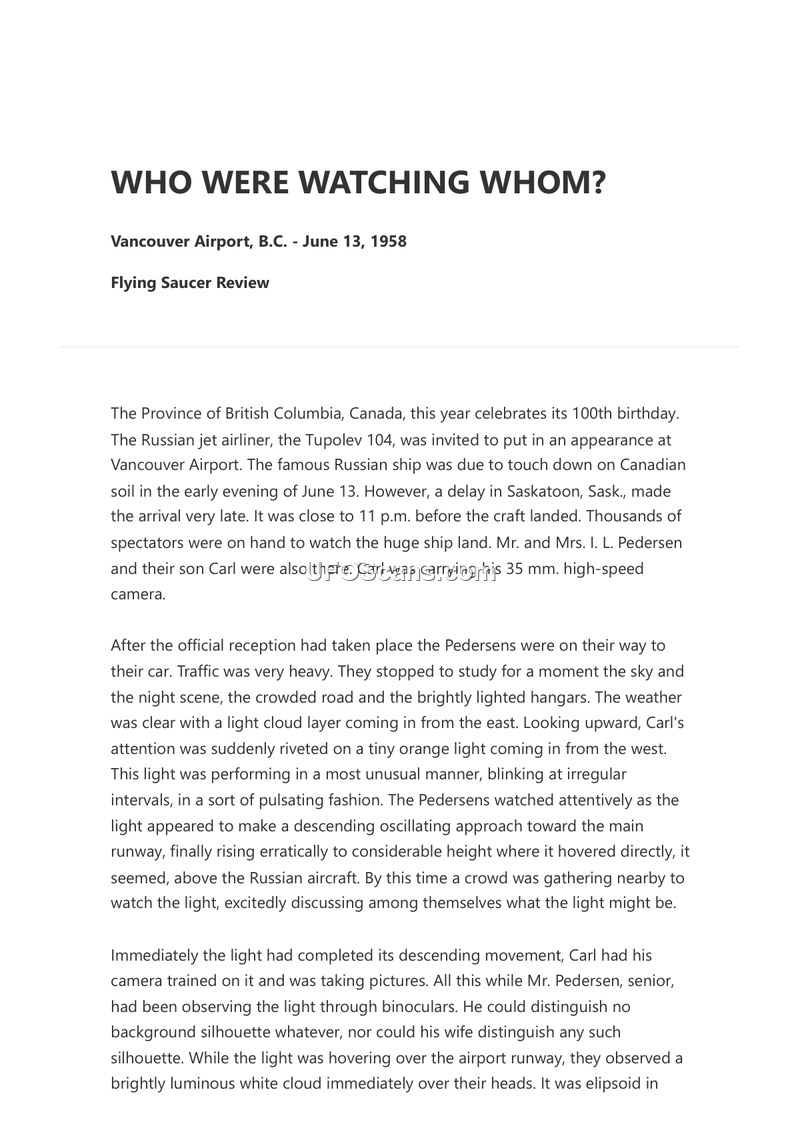 On the evening of June 13, 1958, at Vancouver Airport, British Columbia, a significant sighting occurred during the late arrival of a Russian Tupolev 104 jet airliner. Among the thousands of spectators present were Mr. and Mrs. I. L. Pedersen and their son, Carl, who was equipped with a 35 mm. high-speed camera. Following the reception of the aircraft, the Pedersens observed an unusual orange light approaching from the west. The light exhibited a pulsating, oscillating movement, descending toward the runway before rising erratically to hover above the Russian aircraft. Carl Pedersen captured photographs of the object while his father observed it through binoculars, noting the absence of any background silhouette. Simultaneously, the witnesses observed a distinct, ellipsoid-shaped white cloud directly overhead. Mr. Pedersen reported that something within or behind this cloud appeared to explode fanwise, revealing brilliant pinpoint lights before the cloud divided and later coalesced. Mrs. Pedersen described the orange light as 'dancing' or 'hopping' as it moved toward the luminous cloud, eventually disappearing in a north-easterly direction. The witnesses observed these phenomena between 11:15 p.m. and 11:22 p.m., noting the irony of the situation given the presence of the Russian aircraft on the ground below. The account was subsequently published by Flying Saucer Review, which requested further reports from other observers at the airport.