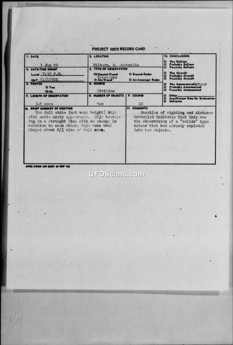 This document is a Project 10073 record card and accompanying questionnaire regarding a UFO sighting that occurred on January 1, 1959, in Kilburn, South Australia. The witness, a member of the Astronomical Society of South Australia, was observing the night sky through a 6-inch reflecting telescope when the event was brought to their attention by a friend. The witness reported seeing two dull white, oval-shaped discs with an 'eerie misty' and 'fuzzy' appearance. The objects traveled in a straight line from the North-Northwest to the South-Southeast over a duration of 3 to 5 seconds. The witness noted that the objects did not change their relative position to one another and made no sound. The witness estimated the size of each disc to be approximately two-thirds the size of the full moon. The weather conditions were described as a clear, cool, and dry night with no wind. The report includes a hand-drawn diagram illustrating the objects' path and relative orientation. The official conclusion recorded on the card suggests that the sighting was the observation of a 'bolide' type meteor that had already exploded into two objects, based on the duration and distance traveled. The witness explicitly stated they did not know where to report the incident, leading them to forward the information to the evaluating agency.