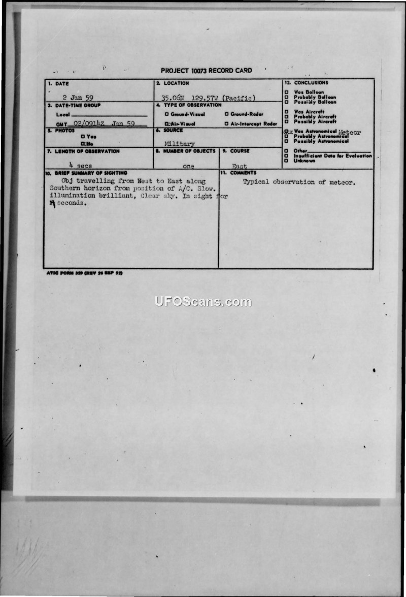 A military report from January 1959 documenting a sighting of a brilliant, slow-moving object in the Pacific. The object was officially identified as a meteor.