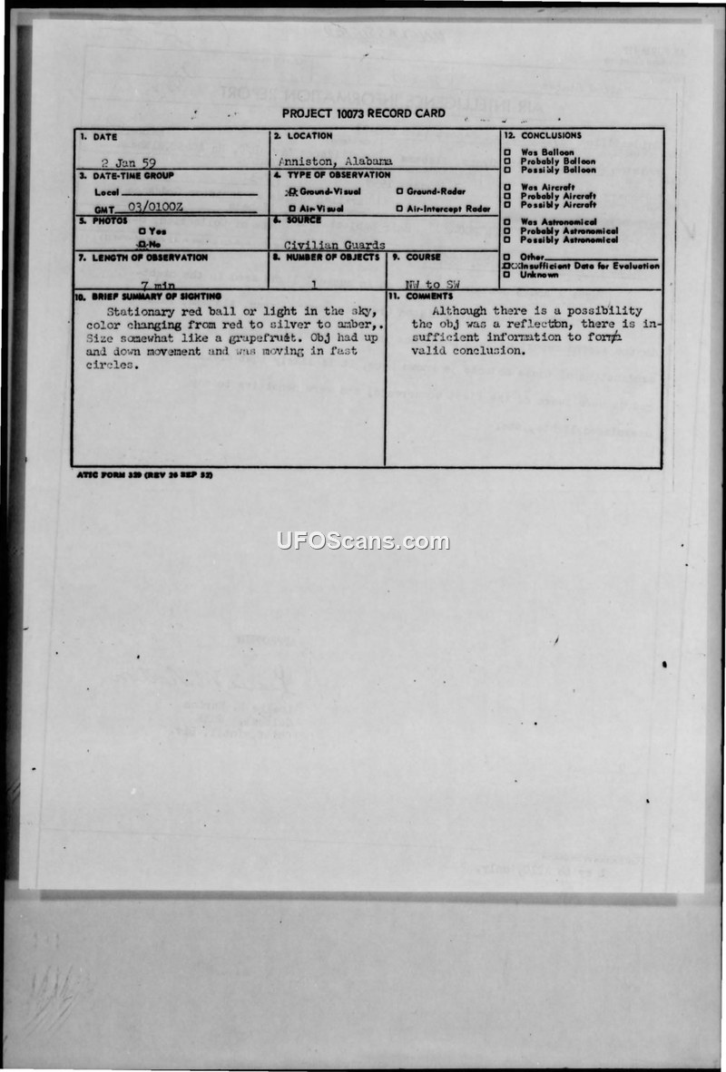 Two civilian guards at Anniston Ordnance Depot reported a stationary, color-changing light in the sky on January 2, 1959. Intelligence officers concluded there was insufficient data to identify the object, suggesting it may have been a reflection.