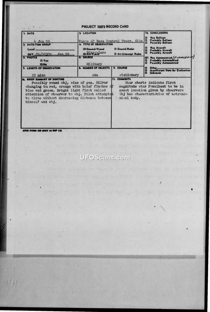 A 1959 UFO sighting at Vance AFB was officially identified by the Air Technical Intelligence Center as the star Fomalhaut, with reported anomalies attributed to atmospheric refraction.