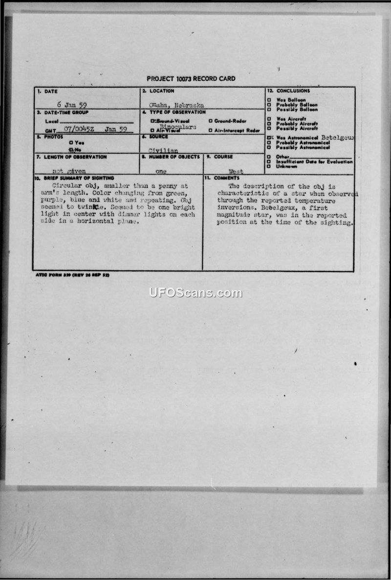 A January 1959 sighting of a 'circular object' in Omaha, Nebraska, was investigated by the Air Force and officially identified as the star Betelgeuse. The report attributes the object's perceived movement and color changes to atmospheric temperature inversions.