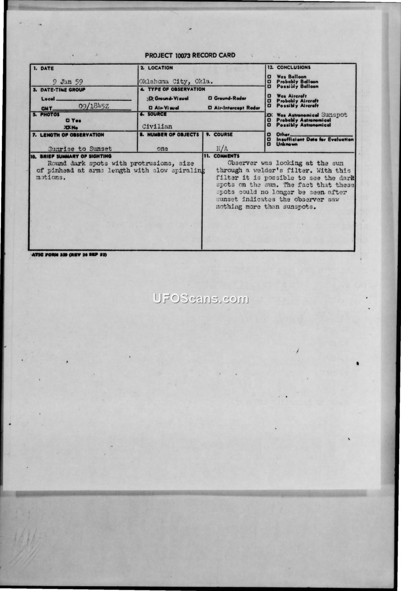 A report of a UFO sighting in Oklahoma City in 1959 was investigated by the Air Technical Intelligence Center. The object was officially identified as an astronomical sunspot observed through a welding filter.