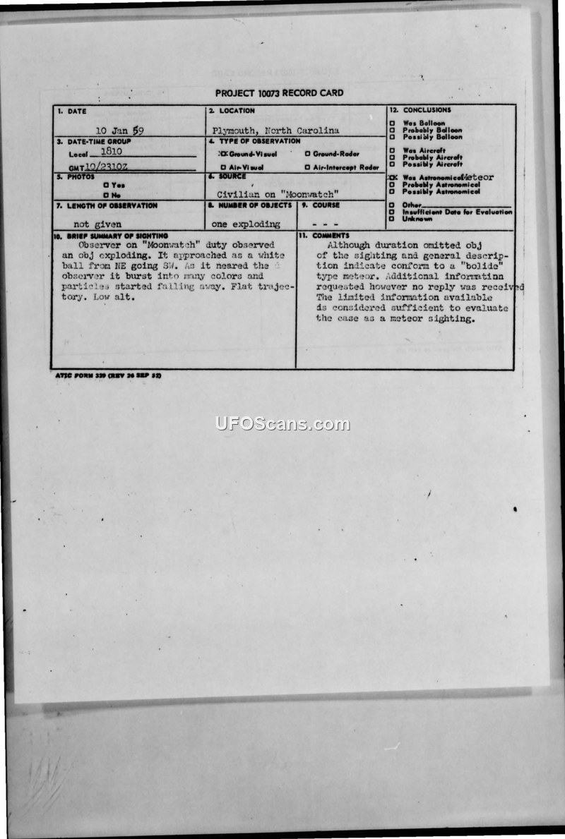 Project 10073 Record Card — Plymouth, North Carolina, 10 January 1959